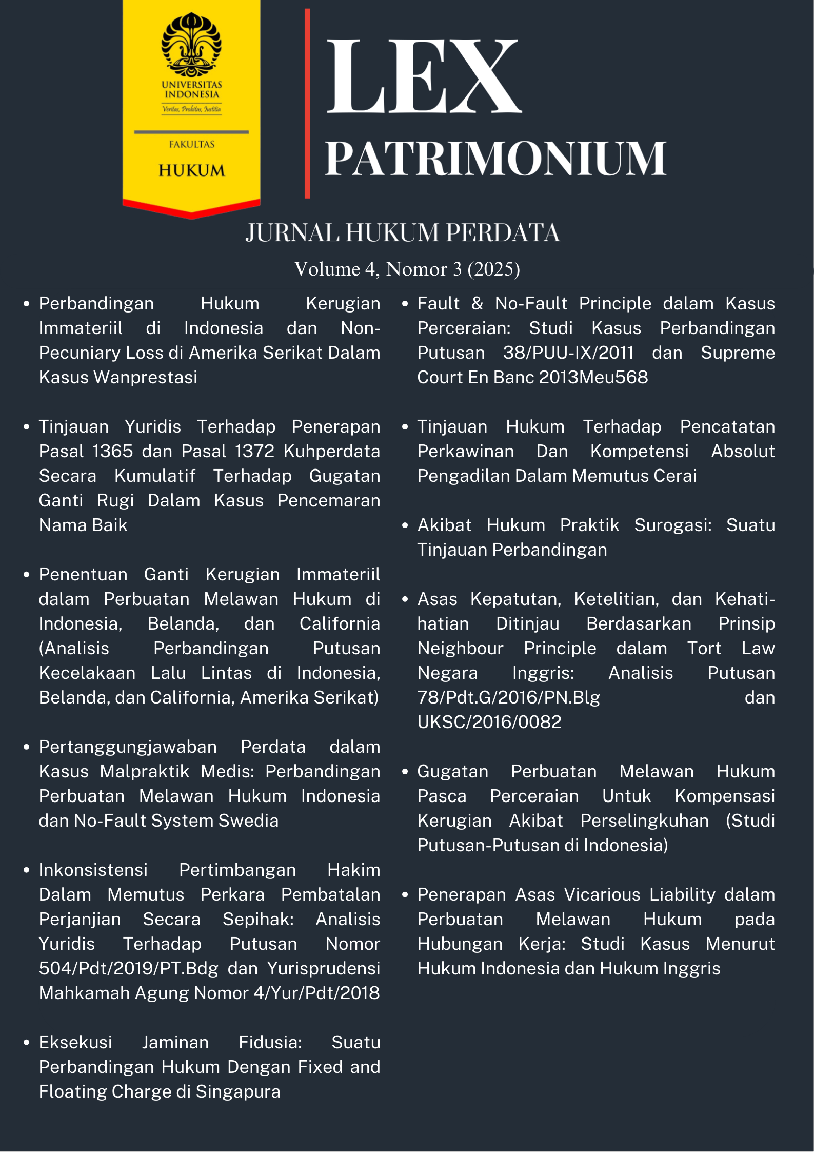 Lex Patrimonium merupakan jurnal akademik yang diterbitkan oleh Lembaga Kajian Hukum Perdata yang bekerjasama dengan Bidang Studi Hukum Perdata, Fakultas Hukum Universitas Indonesia.